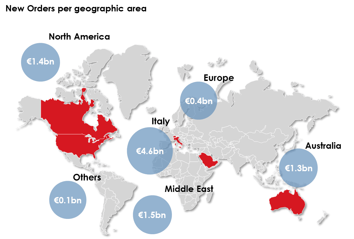 Total new contracts acquired from the beginning of the year, including orders and variation orders in the process of being finalised or negotiated, amounted to €9.3 billion, more than 98% of which in key markets with a low-risk profile. This includes €0.8 billion of tenders in which Webuild was the best bidder. Below is the geographical distribution of the new orders and a list of some of the main contracts acquired: